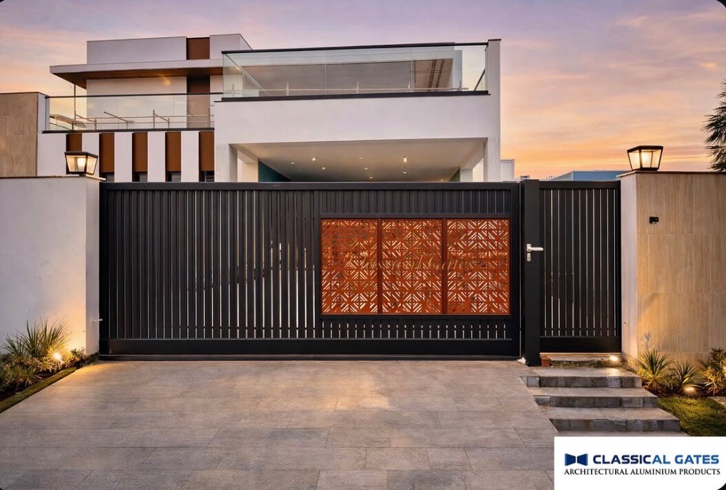 ALUMINIUM SLIDING GATES Engineered for Strength. Designed for Elegance. At CLASSICAL GATES, our Aluminium Sliding Gates are crafted to deliver the perfect balance of durability, smooth operation, and modern aesthetics. Designed for both residential and commercial spaces, these gates provide seamless functionality while enhancing the architectural appeal of your property. Why Choose Aluminium? Aluminium is the future of gate systems—and for good reason: Corrosion Resistant – Unlike steel or iron, aluminium does not rust, making it ideal for long-term outdoor use, especially in Indian climates. Lightweight yet Strong – Ensures effortless sliding movement while maintaining structural integrity. Low Maintenance – No frequent repainting or heavy upkeep required. Sustainable Material – Eco-friendly and recyclable without compromising performance. ADVANCED POWDER COATING TECHNOLOGY Every CLASSICAL GATES sliding gate undergoes a high-performance powder coating process: Uniform, Premium Finish – Smooth, consistent coating that enhances visual appeal. Weather & UV Resistant – Designed to withstand harsh sunlight, rain, and dust without fading or peeling. Long-lasting Protection – Provides an additional layer of durability against scratches and environmental wear. IN-HOUSE COLOUR PRECISION – CUSTOM DYE MANUFACTURING What sets us apart is our complete control over colour quality: We manufacture our own dye formulations, ensuring unmatched consistency and finish. A wide range of custom colours, wood finishes, and premium textures tailored to your design vision. Every shade is developed to maintain richness, depth, and long-term colour stability. SMOOTH SLIDING. SMART LIVING. Our sliding gate systems are engineered for: Space-saving design – Ideal for compact driveways and modern layouts. Effortless operation – Precision tracks and rollers for smooth, silent movement. Automation-ready – Compatible with motorised systems for added convenience and security. STRONG. SLEEK. SUSTAINABLE. Upgrade your entrance with CLASSICAL GATES Aluminium Sliding Gates—where innovation meets timeless design.